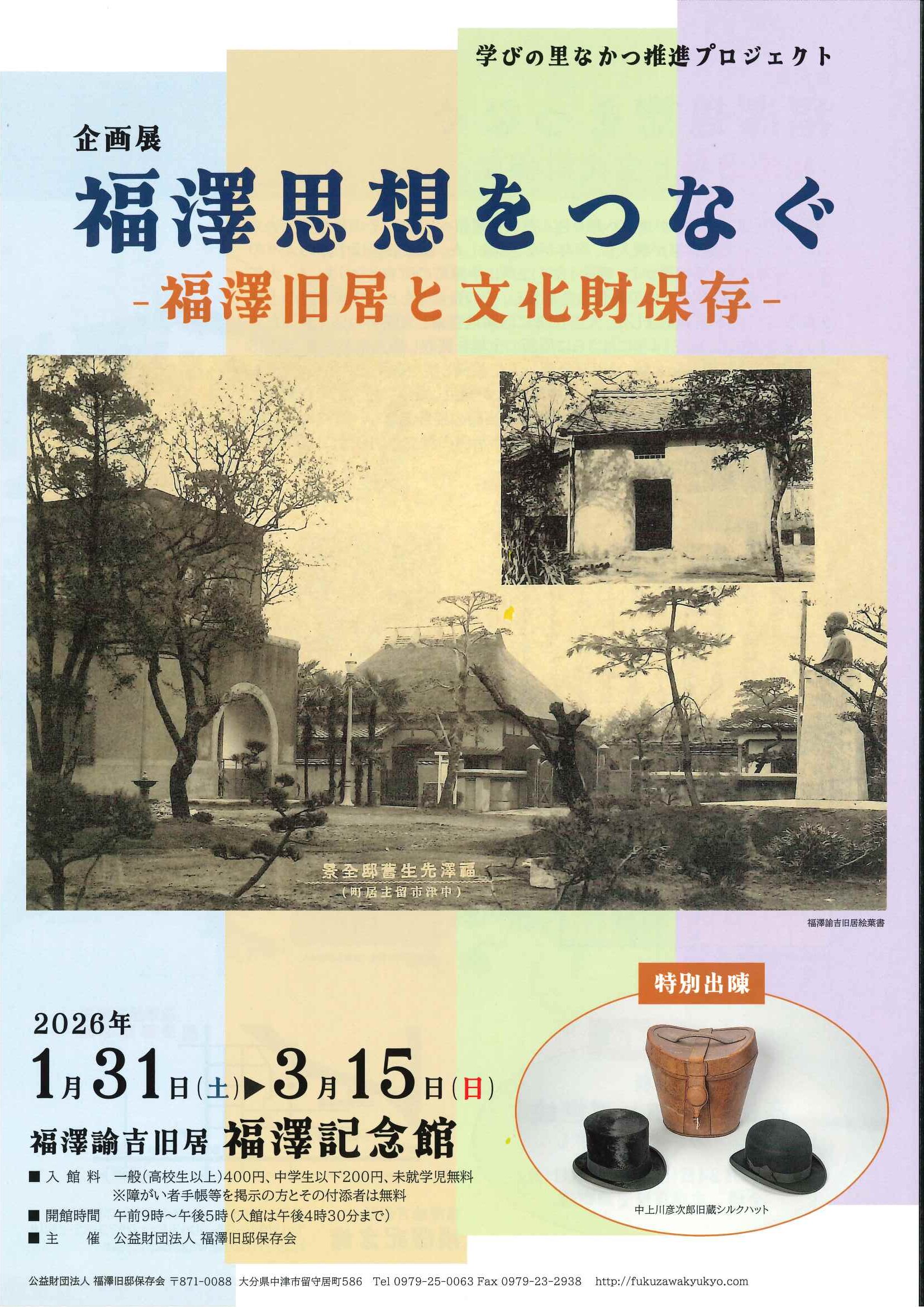 本展では、福澤諭吉旧居における文化財保存活用の歴史を明らかにし、中津に受け継がれた福澤思想を紹介します。