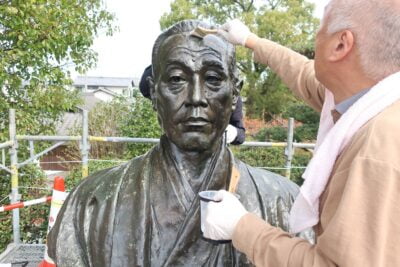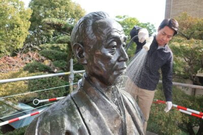 銅像の洗浄とビーズワックス(蜜蝋)の塗布を行うことにより、酸性雨による腐食を防ぎます。
