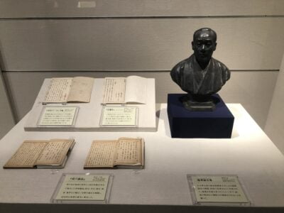 当館からは彫刻家朝倉文夫作の福澤諭吉像や、著作『会議弁』など10点(後期展示11月23日より9点)の資料が展示されています。